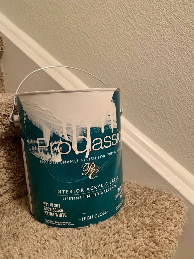 Now the following steps can be completed either way! We decided to paint the spindles first and then stain the base and handrail. We taped everything off accordingly. We did one coat of primer using a normal 1″ paint brush and found that to be sufficient (this will depend on your sanding job, so take your time). Make sure to let each step dry between 24-48 hours before painting the next coat. The painting step takes time! It is usually helpful to have a buddy and a glass of wine :). We popped the paint(Color Snowbound, type pictured in supplies) and started with the same paint brush and realized that the roller really helped remove any brush makes. Depending on your width of your spindles and or if you have design in them will determine if you can use the roller. If not gently used the foam roller to get any additional brush makes out. We decided we wanted to do two sides at a time and learned very quickly it was leaving drips in places that were not good. 4 spindles down we were ready for another glass of wine. We finally got the groove and did the complete spindle trim (along taped areas) and the other a few behind would roll the rest. We would go back and forth and made a fun game that if someone found a hidden drip you got a 1 min break. The best advice I have it TAKE YOU TIME!!! How the first coat of paint looks is crucial for your final project! After 48 hours repeat with coat two of paint let sit for 1 hour and remove painters tape.