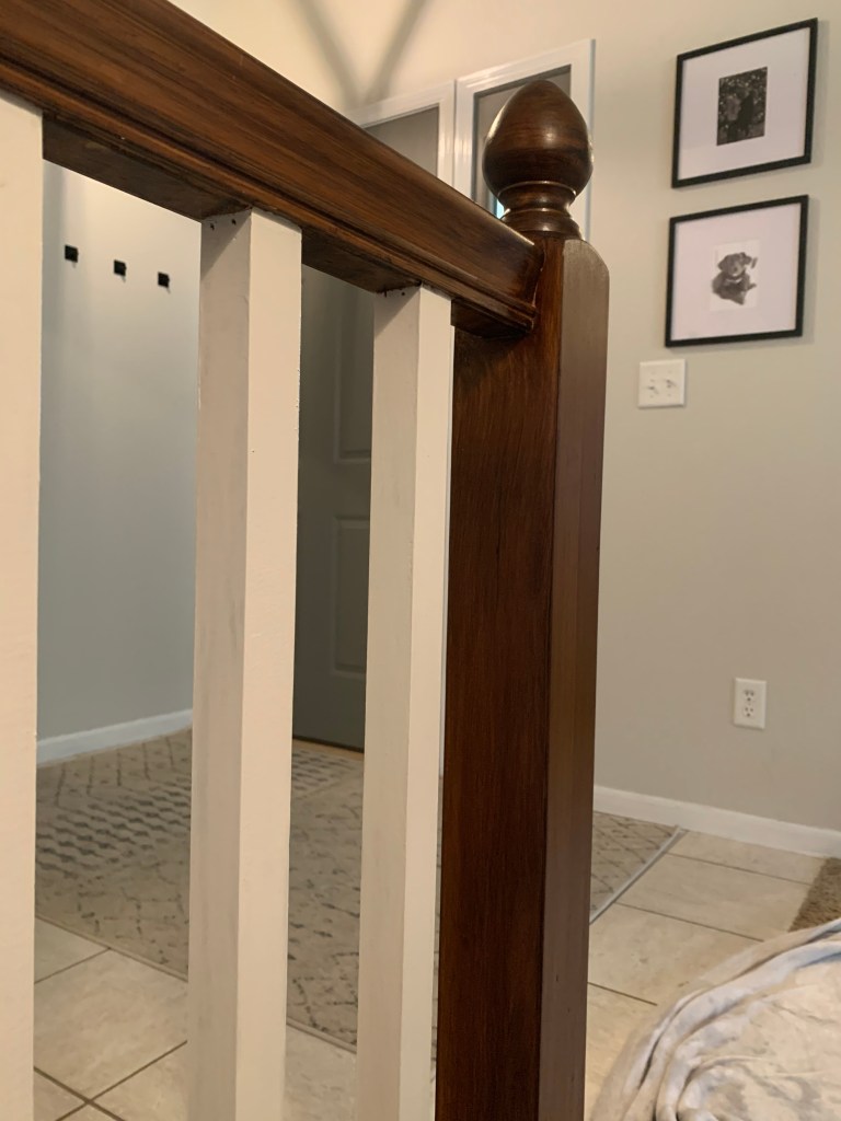 If you have not lost hope yet kudos to you! You totally got this! After waiting another 48 hours you can tape off the painted spindles to start the staining step! Press firmly at the joints but don’t press super tight at the end of the tape to help it not stick. I found that doing the under portion of the railing first was good and then moved to the base. I followed the staining instructions and did light coats to help it dry and easier clean up when needed. After I got all the smaller areas done I used the foam brush to apply it to the top of the hand rail and used the stain sponge to rub it in along the whole banister. I was instantly IN LOVE!!! The whole area just came to live and I was so excited to get this project done! We completed the staining step 3 times to get the desired color but this will differ based on your preferences! NOW IS THE WAITING!! DON’T TOUCH!!!