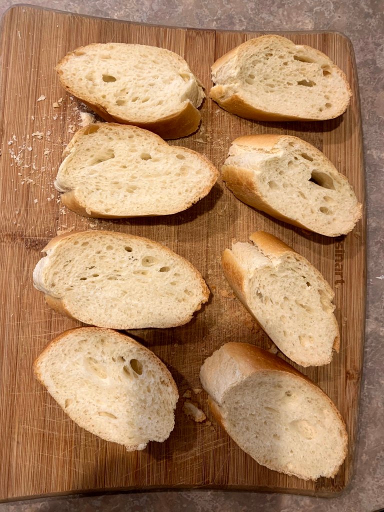 C. Slice the baguette into 8 thin slices; arrange on the baking sheet. toast the bread under the broiler until golden brown, about 3 minutes, turning the slices halfway through. Remove from the oven. Remove the bread from the baking sheet.