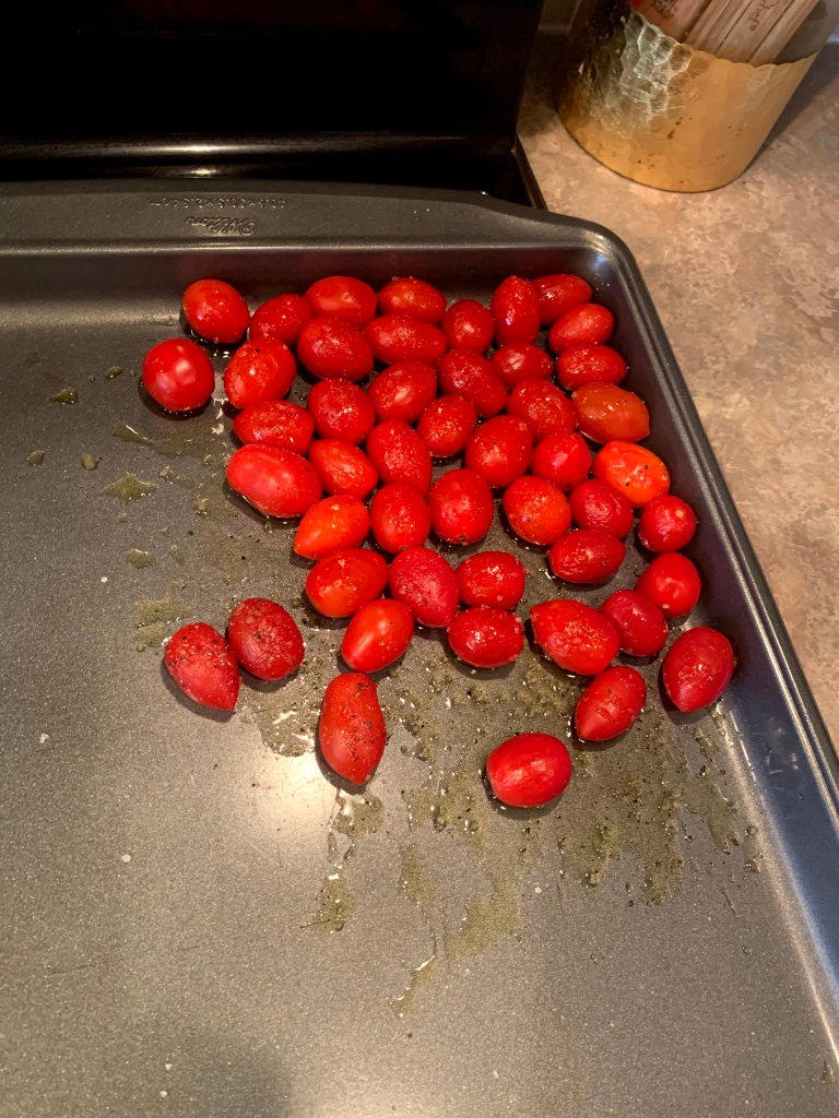 4. Reduce the oven temperature to 450*F. Toss the cherry tomatoes with the oil, half the salt and pepper, and sugar; place the tomatoes on the baking sheet and bake at 450*F for 20 min. (I did not use the sugar and it tasted great)